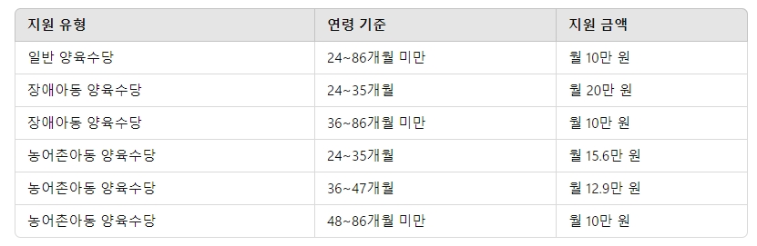 가정에서 부모가 직접 아이를 양육하는 경우, 국가에서 지원하는 보육 지원금입니다. 어린이집이나 유치원을 이용하지 않는 영유아를 대상으로 지급됩니다.