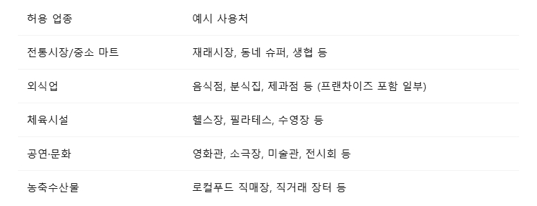 사용 불가 지역은 대형마트, 백화점, 온라인 쇼핑몰 (일부 지역 앱 사용 예외 인정), 유흥업종, 사행산업 등