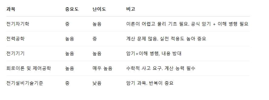 ✅ 전기기사 과목별 중요도 및 난이도 분석