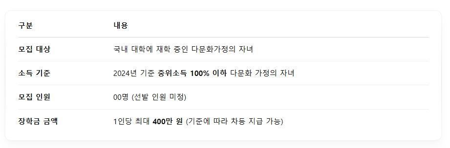 매년 다문화가정 자녀들을 위한 실질적인 장학지원을 펼쳐온 ‘명인다문화장학재단’이 2025년도 1학기 대학 장학생을 모집합니다. 경제적 부담을 줄이고, 학업에 더욱 몰두할 수 있도록 설계된 이번 장학사업은 최대 400만 원 규모의 현금 지원이 제공됩니다.
