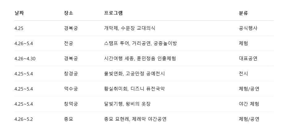 궁중문화축전은 단순한 전통행사가 아닙니다. 우리의 문화유산이 살아 숨 쉬는 공간에서 직접 느끼고 경험할 수 있는 축제입니다. 예약 없이도 즐길 수 있는 열린 축제로, 누구나 궁궐 속 시간여행자가 될 수 있죠. 아이들과, 가족과, 친구와 함께 고궁의 매력에 빠져보세요.